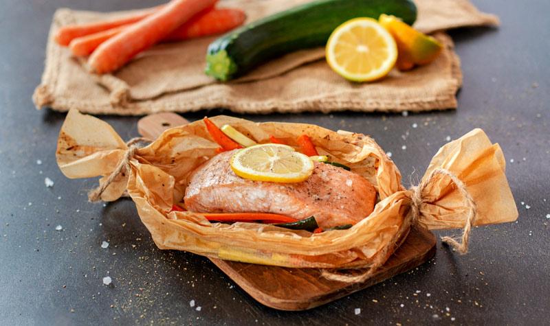 Zum Verschließen der Päckchen die langen Seiten des Backpapiers in der Mitte über dem Fisch schließen und mehrfach ineinander rollen.
