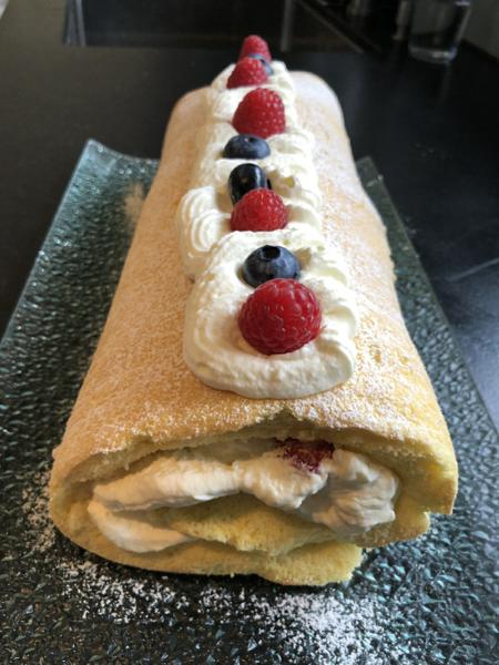 Mit Sahne und Früchten bestreichen.