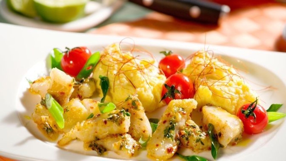 Gemuesepueree auf Tellern anhaeufeln, mit Chilifaeden garnieren, Cocktailtomaten mit ansetzen, geschnetzelten Fisch daneben mit anrichten und mit geschnittenem Koriander und gezupftem Zitronenthymian garnieren.