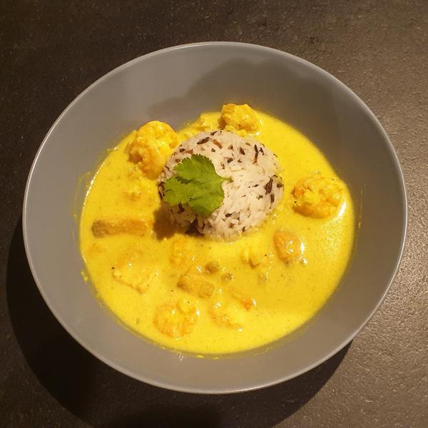 Das Lachs-Curry zusammen mit dem Reis auf einem Teller anrichten.