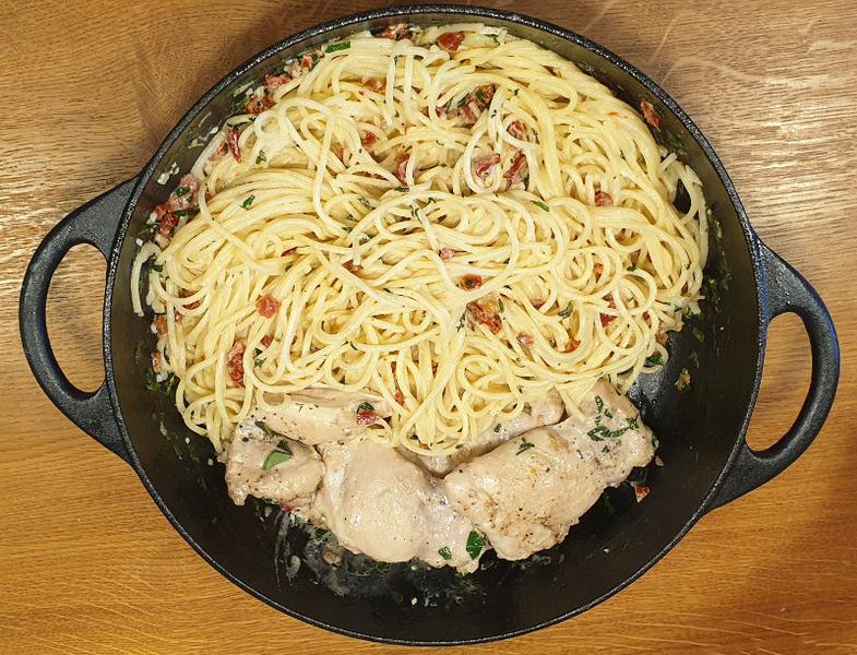 Das Hähnchen auf der Pasta anrichten, die restliche Sauce darübergeben.