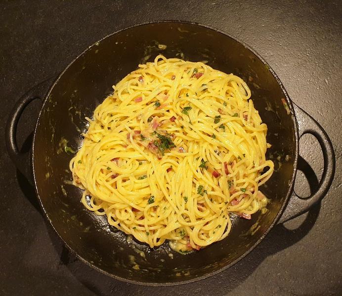 Die Ei-Parmesanmischung über die heissen Teigwaren geben und alles schnell durchmischen, damit die Eier binden.